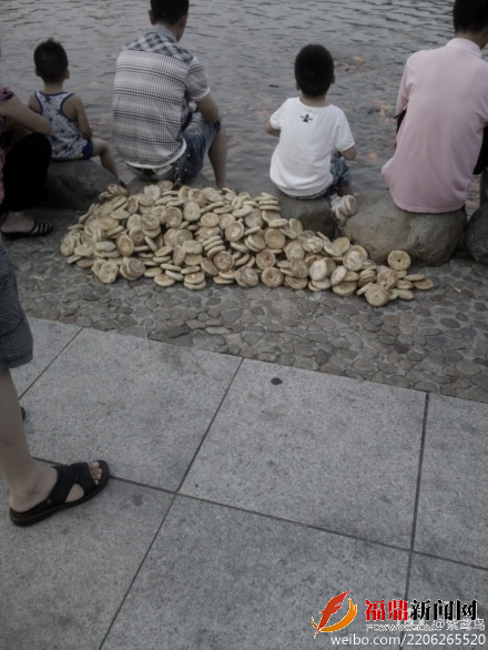 记者在@紫鸢鸟的微博上发布的图片看到,在桐山桥下,两个大人与两个小孩子坐在岸边正在给溪内的鲤鱼喂食。而在他们的身后,放着一堆光饼,据博主说是这一家人花了100块钱买的,有200个光饼之多,从图片上看这家人的举动还引来身后路人的围观。