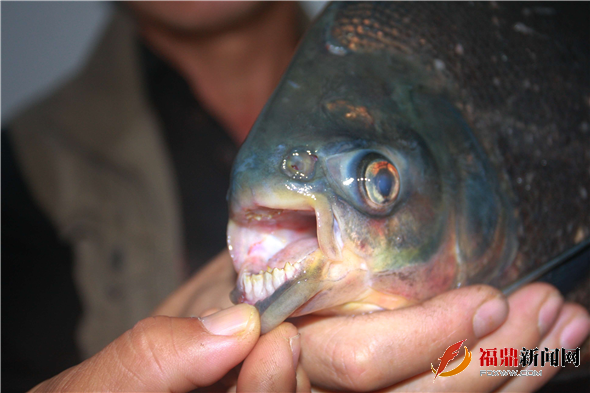 两位老师从照片上判断,此鱼应该是短盖巨脂肪鲤,中文名称为淡水白鲳,为热带和亚热带淡水鱼类,1982年引入台湾养殖,1985年进入我国,后成为我国养殖鱼类而推广,福建各地有养殖。与所说的红食人鲳(又称食人鱼)同科不同属,外观有点像,体色不同。红食人鲳为观赏鱼,体色鲜艳最大仅32cm左右。 最大的差别是红食人鲳上、下颌齿只有1行,下颌齿有28-31枚;上、下颌闭合时呈锯齿状嵌合。淡水白鲳上、下颌齿各有2行,下颌第一行仅12-14枚,第2行2枚;口闭合时,上、下颌齿呈平行接触。红食人鲳被我国定为有害侵入鱼类,早期引进作为观赏鱼类,后禁止。而淡水白鲳为淡水养殖鱼类,在福鼎溪水中发现可能是从池塘中出去的。在我国养殖多年后也耐低温了。