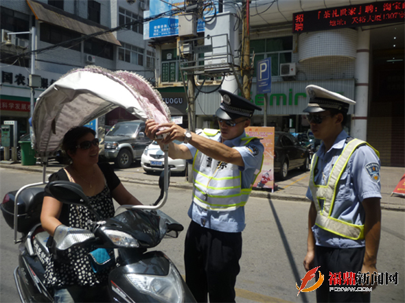 福鼎新闻网讯(汪晶晶)当前天气炎热,一些摩托车、电动车驾驶员为遮挡热辣辣的太阳,不顾自身和他人安全,私自安装遮阳伞上路行驶,而且有日益增多的趋势,严重影响了城区道路交通安全秩序。日前,桐山派出所就针对这种现象开展了治理电动车安装遮阳伞违法行为专项整治行动。