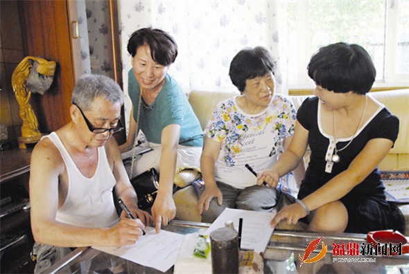 桐城街道富民社区干部在走访社区居民时指导走访对象填写意见登记表