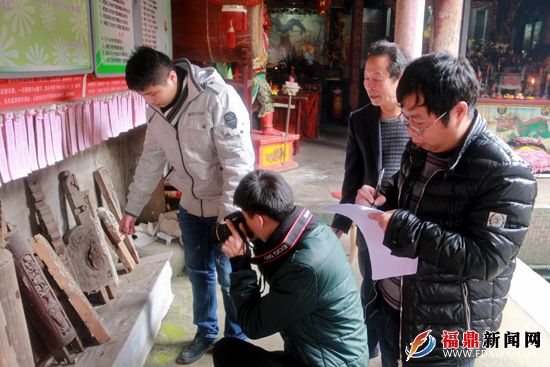 25日上午,福鼎市博物馆的工作人员对点头妈祖天后宫内的木雕、石雕进行细致认定与文物影像信息的采集工作。对文物的文物名称、类别、级别、年代、质地、外形尺寸、质量、完残程度、保存状态、包含数量、来源方式、入藏时间、藏品编号、收藏单位名称等19项基本指标项进行逐项登记,有条不紊。