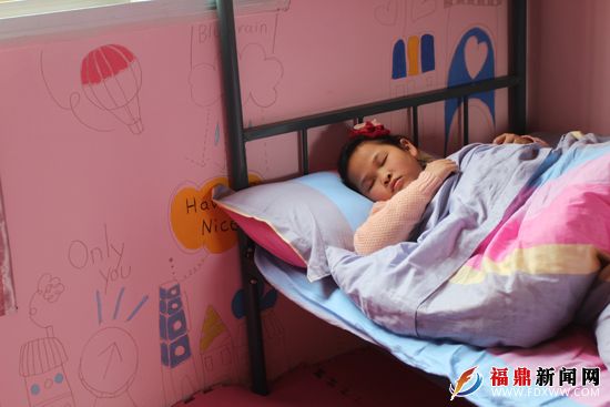 5月5日中午,记者来到了西宅小学爱心午休室, 17个孩子们的笑容温暖而灿烂。床型是上下铺,地上被铺上了地垫,女生休息室被粉刷成粉红色,而男生休息室则是天蓝色,墙壁上还有很多温馨漂亮的手绘图。白云、蓝天、森林、树叶、卡通人物、天马行空的建筑等。