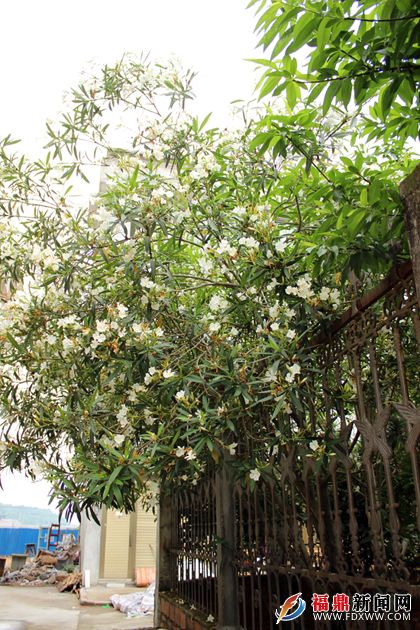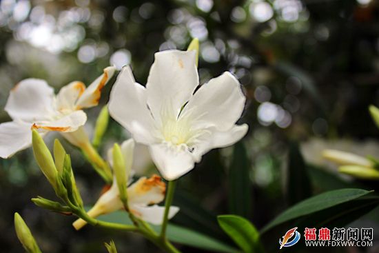近日,笔者在福鼎市点头镇一居民院落里发现盛开着的夹竹桃花。夏季正是夹竹桃生长旺盛的季节,院子里的夹竹桃长势良好,白色的花朵挂满枝头煞是好看,还透着淡淡的清香。不过,这么艳丽的花儿大家千万不要采摘,因为夹竹桃汁液有毒,如果误食会造成消化系统、心脏和神经系统中毒。