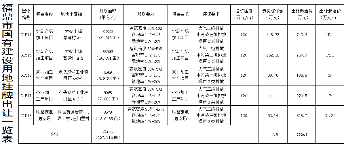 根据《福建省国有土地使用权挂牌交易管理办法》和《福建省工业用地招标拍卖挂牌出让实施办法》的规定,经福鼎市人民政府批准,决定公开挂牌出让太姥山镇、点头镇、桐城街道共五宗面积合计为84744平方米国有建设用地使用权(具体项目见附表)。现将有关事项公告如下: