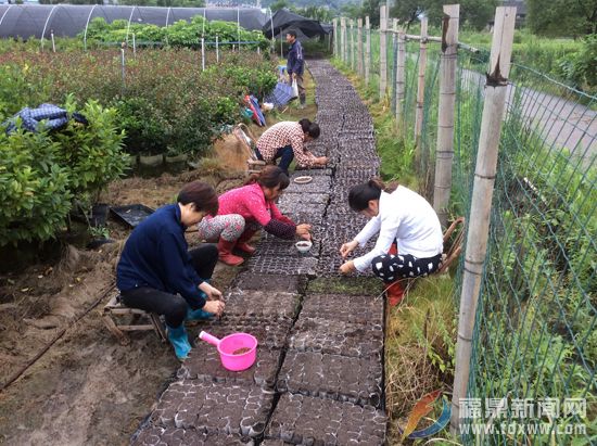 近日,在观洋村珍稀树种苗圃里,笔者看到,培育树苗的塑料杯竖成行摆放整齐,花卉工人们三五成群,正在将土壤装入杯中,然后将花卉种子播入杯中的湿土里,盖好遮阳网,呈现出一派的繁忙景象。