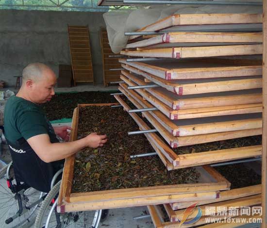 朱国恤在翻看晾晒的茶叶情况