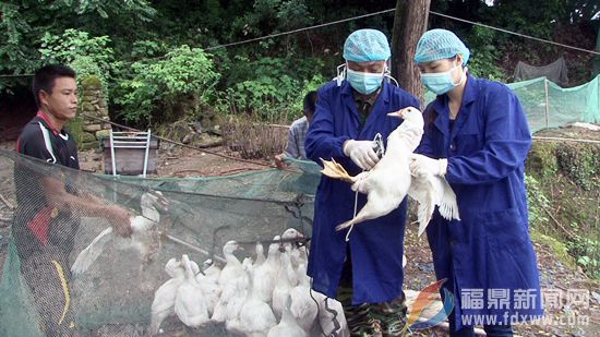 7月21日一大早,福鼎市康健动物疫情防疫专业合作社的顾孔杰、周映芬等二位防疫员冒着小雨来到江美村民的郑宣玲养殖场,为他家的500只鸭子免费接种鸭瘟疫苗。抓鸭子、注射疫苗…顾孔杰一边熟练地操作着,一边为养殖户讲解高温气候环境中动物养殖注意事项。