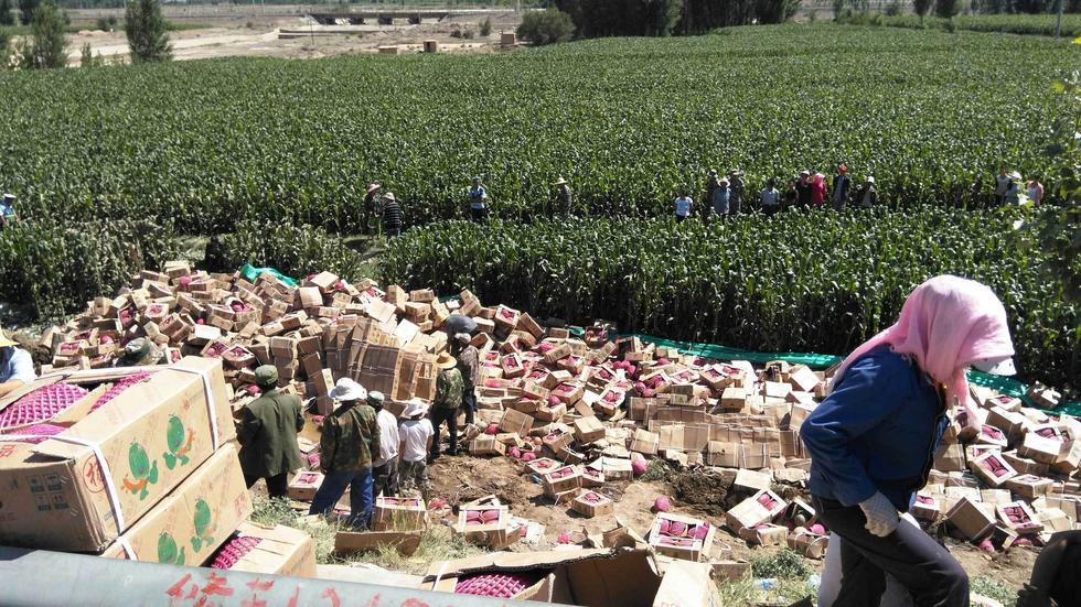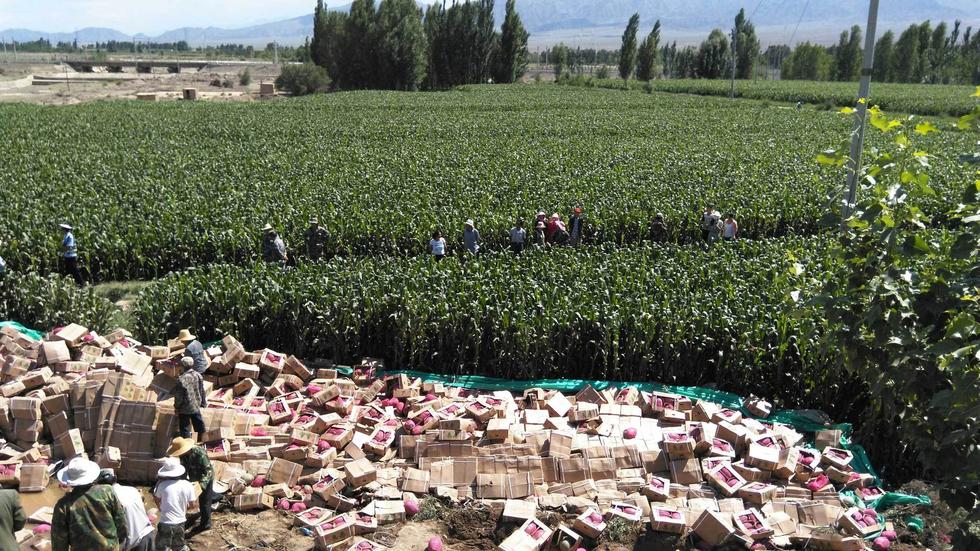 据中国张掖网消息,甘肃张掖。一辆满载小香瓜新疆大货车在G30高速公路临泽段发生侧翻,车上所载货物小香瓜翻下路面,遭到周边村社群众哄抢。警察赶到后,进行了制止,但由于哄抢群众太多,场面一度失控。目前,所幸没有人员伤亡,事故原因正在进一步调查中。图为群众在围观散落在路边的货物。图片来源:CFP
