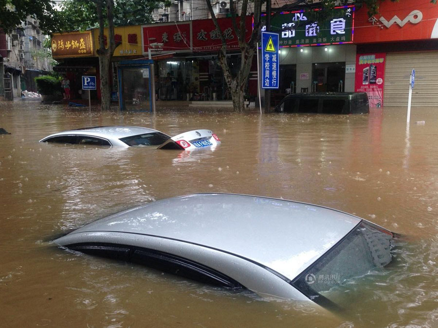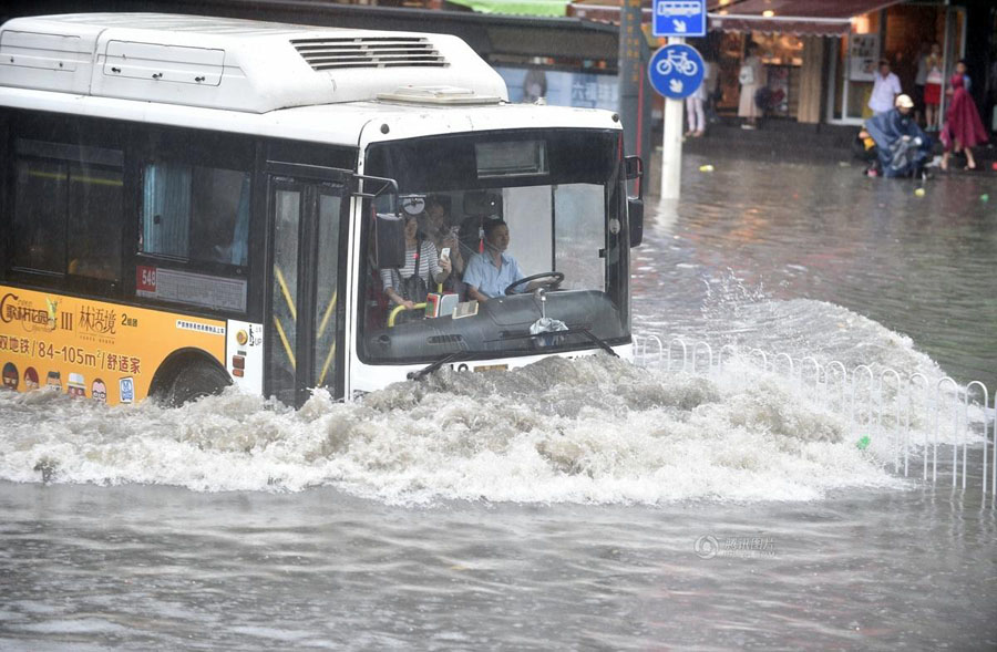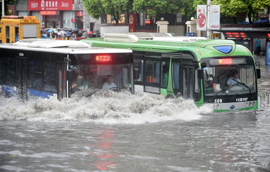 7月23日8时起至16时30分,武汉市突遭大暴雨袭击。降雨强度达50年一遇水平。武汉市多处出现大面积的渍水,网民纷纷通过社交网络曝出武汉全城被淹,到武汉看海 、捕鱼、划船的画面。由于道路已经成为一片汪洋,不少车辆成为此次暴雨的“牺牲品”,而也有不少司机“偏向虎山行”,网友调侃“在武汉不会开船的司机,不是好司机。”图为在解放大道永清街,道路中断,为让市民通行,公汽淌水过中断的永清街,犹如在水中开“巡洋舰”。Shepherd C.ZHOU/东方IC