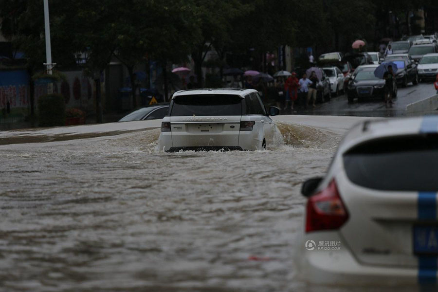 武昌杨家湾积水严重,车子好似在波浪中前行。
