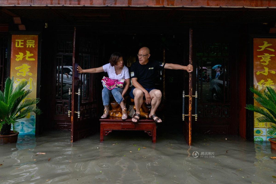 在江岸区台北路,暴雨导致的严重渍水近一米深,渍水漫入周边商铺,店主坐在餐桌上避水。唐麦卡任/东方IC