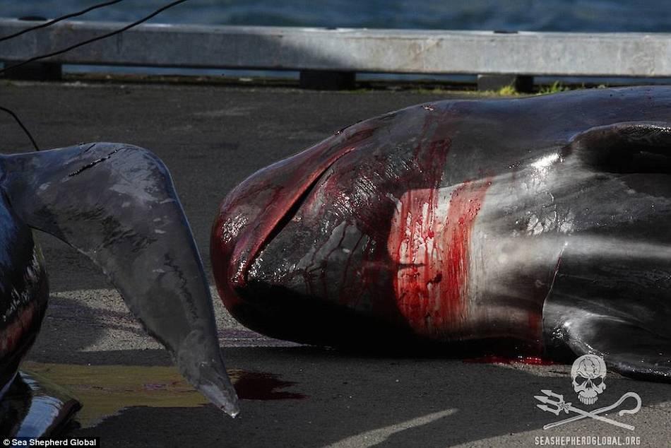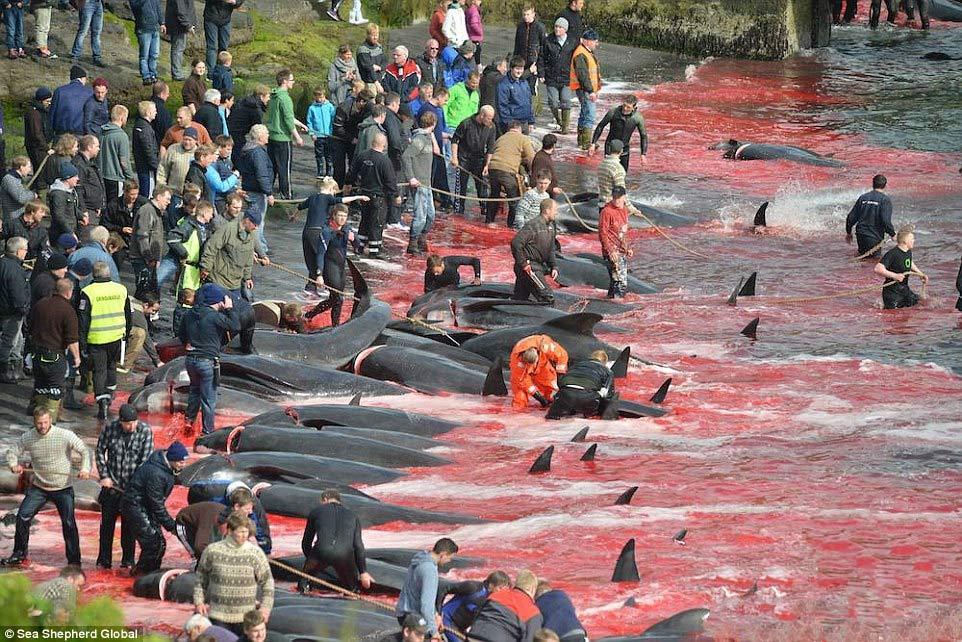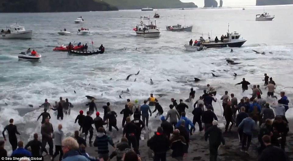 屠杀在海滩上演,大量当地民众围观。宰杀鲸鱼在当地虽然不违法,但颇具争议。