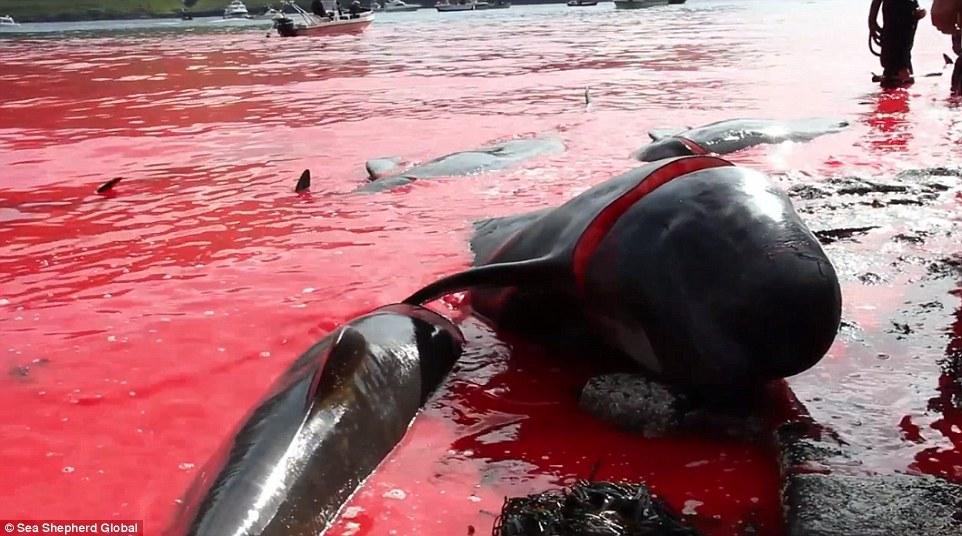 所有的鲸鱼都在海滩被杀死,海面被血水染红。