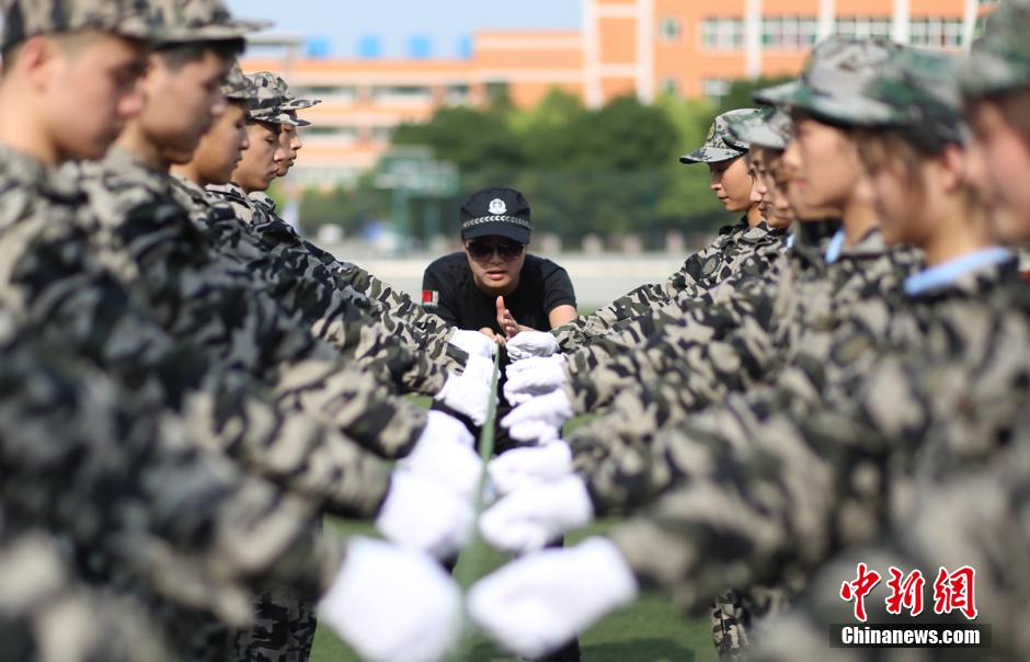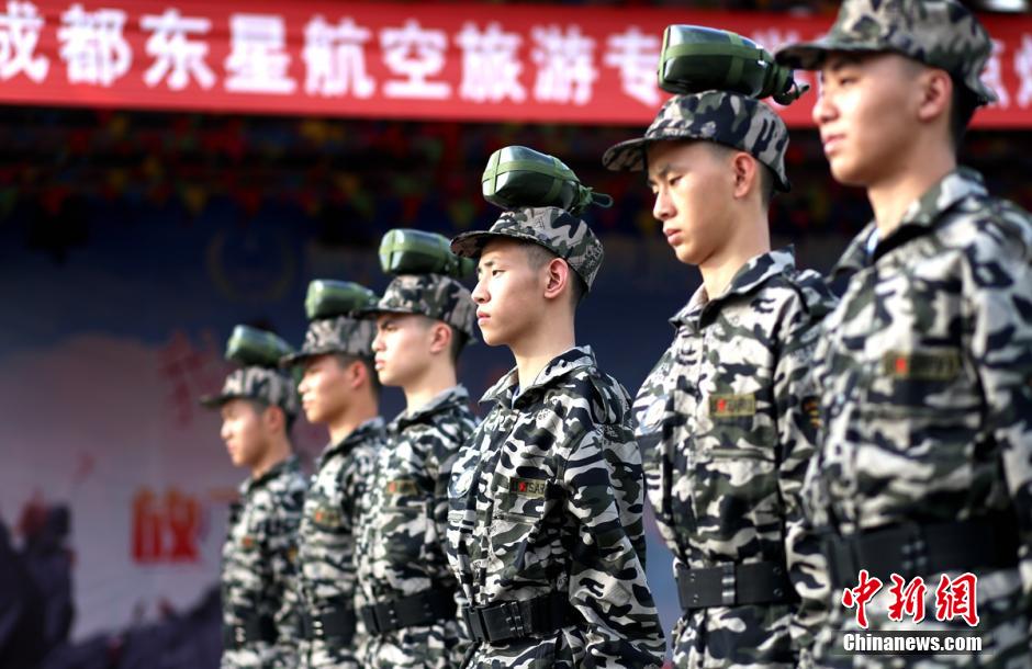 7月27日,成都东星航空专修学院2015届新生军训开始,炎炎烈日下,参加军训的学子们头顶矿泉水瓶,手挂水壶,身背十字木条,衣领口别扑克牌站军姿列队……据悉,该校新生军训将为期15天,新大学生们将进行包括队列、擒拿格斗、警棍盾牌术等科目的军训。张鑫摄