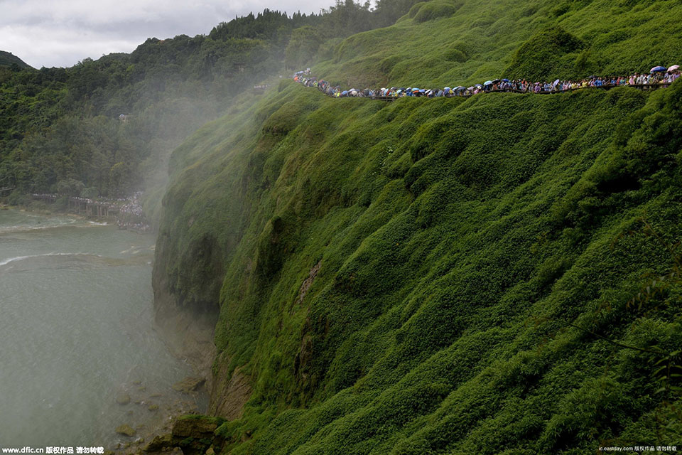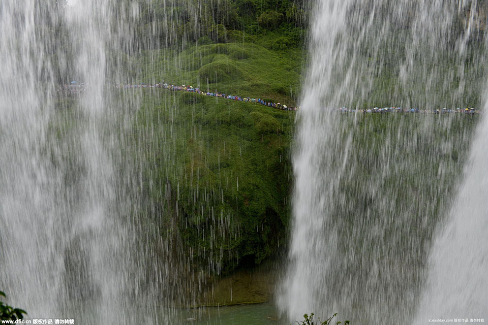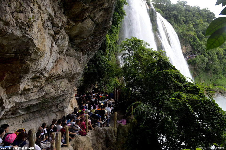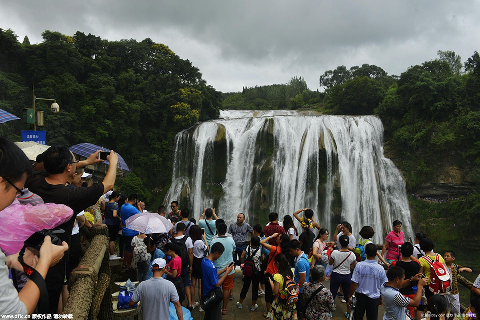 2015年7月29日,贵州黄果树景区,前来观瀑的游客爆满。进入雨季后,贵州降雨增多,著名的黄果树瀑布在丰水期飞流直下,气势磅礴。壮美的大瀑布下,前来观赏瀑布的游人如织。夏季是贵州的传统旅游旺季,每年进入7月起,贵州即迎来传统旅游旺季,各地游客纷纷涌入贵州避暑纳凉。特别是黄果树大瀑布由于水量充沛,瀑布飞流直下,蔚为壮观,景区游人如织,呈现“人海看瀑布”的壮观景象。
