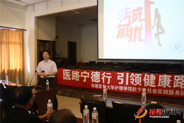 福鼎新闻网讯(易闻 潘云舟)7月9日,在秦屿镇政府礼堂,福建医科大学护理学院“三下乡”太姥山实践队联合福鼎市第二人民医院举办了一场医疗卫生公益讲座。此次讲座由省健康巡讲专家、附一消化科主任庄则豪教授主讲。此次讲座主题为:消除健康误会,少于医院约会。讲座从现在流行的电视约会节目为开场,通过列举生活中显浅易懂的道理宣传健康知识。讲座结束后讲师还与在场观众进行互动,答疑解惑,会场内气氛十分热烈!本次活动带动了秦屿人民对健康的认识,增强了秦屿人民的医患意识。