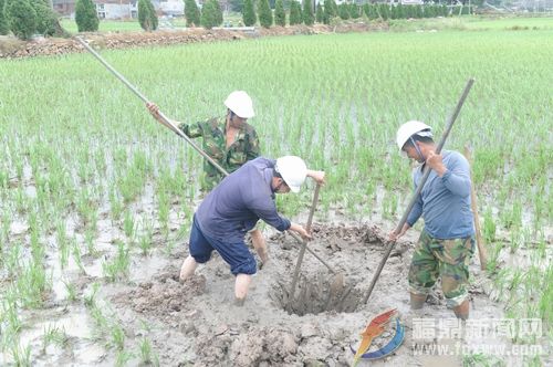 店下镇杨岐片区受损线路经过的区域为大面积农田。在“苏迪罗”台风的巨大威力下,现场10千伏线路电杆不同程度受损,断裂和倾斜的电杆多达35根。抢修队员们争分夺秒,在水田里进行抢修校正作业。通过防风拉线,把倾斜电杆扶正,并加固基础。扶正一根电杆,大约需要一个小时的时间。在多个抢修小组的同步努力下,原本整排倾斜的电杆逐步恢复。而倒杆的处理则困难的多,由于稻田里都是淤泥,刚挖开的杆洞会立刻垮塌。为解决这一问题,抢修人员用簸箕、水桶将杆洞固定住,避免水进入,把杆洞彻底挖出。挖一个杆洞,比正常的地段要多三倍的工作量。目前,抢修人员还在马不停蹄地开展抢修,力争在最短的时间内恢复供电。
