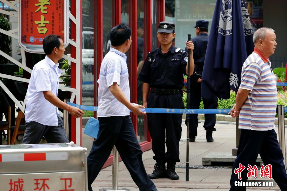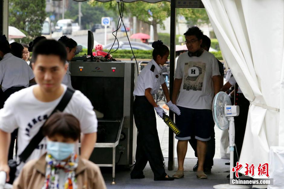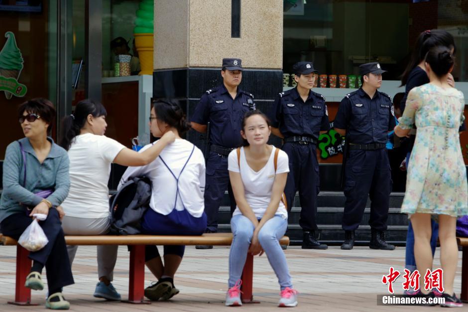 8月31日,中国人民抗日战争暨世界反法西斯战争胜利70周年阅兵式在即,从8月20日开始,北京各主要大街、社区、商场等人流密集场所,出现85万名佩戴着红袖标的群防群治力量,携手警方助力安保任务。图为位于北京市王府井大街的商场门外,工作人员对人员、包裹进行安检。中新社发 李慧思 摄
