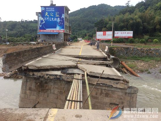 973县道沿白线福鼎市点头镇马洋公路桥是福鼎市往点头镇的的咽喉路段,8月13日,罕见的暴雨引发特大洪峰导致桥面垮塌,同时导致交通中断,人员、车辆无法通行。行桥冲毁后,当地党委、政府第一时间进行现场查看,设置安全警示标志。次日,市交通部门安排客运车辆上高速往返通行,当地政府引导小型车辆及摩托车绕江美村道通行,分流来往车辆。