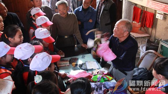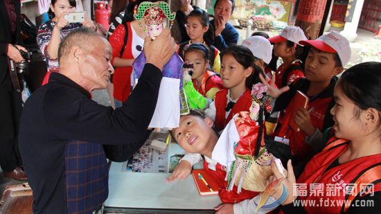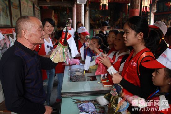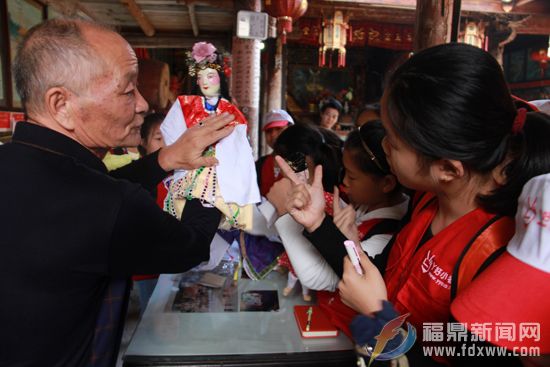 在点头妈祖天后宫,穿着统一的红色小夹袄、胸前带着“小记者”牌的小记者团一行,精神抖擞地参观了“妈祖信俗”的活动宣传图片、查阅资料。天后宫的相关负责人朱乃選老师详细讲解妈祖的传说以及点头天后宫开展妈祖信俗活动的情况,小记者们一边认真聆听,一边不停的记录着。随后,福鼎市级非物质文化遗产名录的点头民间布袋戏传承人洪玉厚老师给小记者们上了一堂生动活泼的民间木偶表演课。洪老师向小记者们讲解木偶表演基本知识与地方特色,现场展示了布袋戏布偶的操作技艺,积极与小记者们互动,场面活跃,老艺人精彩表演赢得了阵阵掌声。