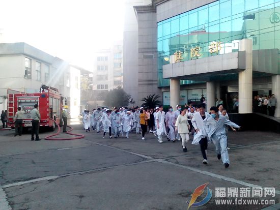 为迎接119消防宣传日的到来,11月7日下午,15时30分,消防演练在福鼎市医院李桂心院长的指令下开始。初起火灾点位于慈济大楼五病区开水房,值班人员第一时间使用附近的灭火器灭火,正在医院上班的医务人员发现火警后,及时向“119”报警,及时组织住院病人捂住口鼻,迅速从五楼、六楼两侧楼梯安全出口紧急疏散。这是福鼎市卫计局、福鼎市医院、市消防中队在市医院组织开展消防安全演练疏散中的一幕。当天有市卫计局、应急办、安办、市医院、卫生计生系统各医疗单位分管领导和安全保卫科长参加。演练分为消防应急演练领导小组、灭火行动组、疏散引导组、安全防护组和医疗救护组。