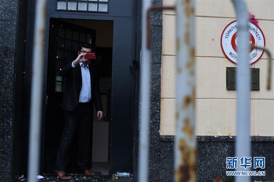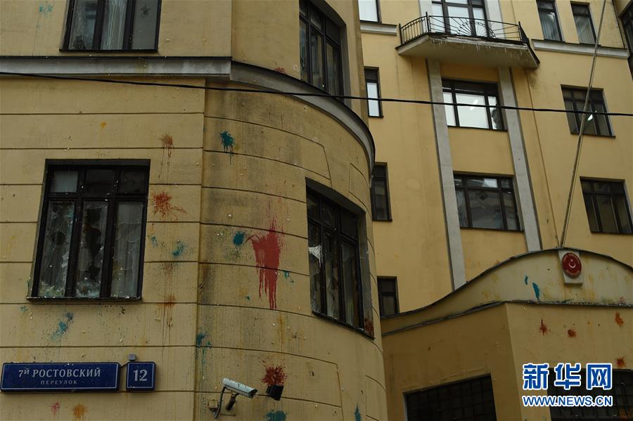 11月25日,在俄罗斯莫斯科,土耳其驻俄罗斯大使馆的玻璃窗被示威民众击碎。俄罗斯民众当日在土耳其驻俄罗斯大使馆外示威,抗议24日土耳其空军战机将执行对叙利亚境内极端组织实施军事打击的俄罗斯空军一架战机击落。新华社发(叶甫盖尼·西尼岑摄)