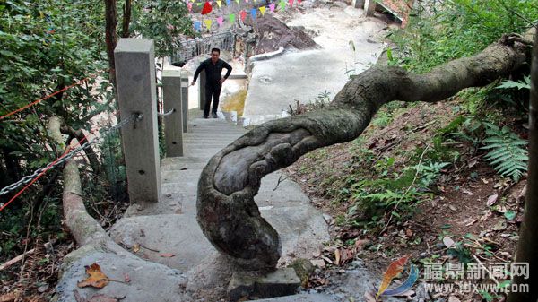 当地村民余先生告诉笔者说:“这棵枫树是今年村民们修建登山步道时发现的,当时整棵树就躺在坡上,因不影响村民通行,造型又比较另类,所以就被保留下来,躺着生长的枫树横跨步道,一些村民出入步道,从这倒树上经过时,有的还将弯曲的树干当成歇息凳子,在树干上坐坐,感受天然的歇息工具。”