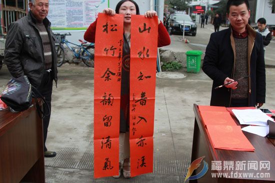 活动现场,闻讯而来的农民群众围拢在一字排开的书案前,选择自己喜欢的对联。笔者注意到,20位书画家挥毫泼墨,笔走龙蛇,字体遒劲有力。10余位青年志愿者忙着服务群众。接过一副副崭新的对联,群众笑容满面、爱不释手。“以前,我都是买印刷的对联,好多年没有贴过手写的对联了,没想到今天能‘求’得这样的对联,真是难得。同时我们赤溪村伴随着旅游产业的发展,新农村建设一天一变样,活动所赠送的对联以‘新农村建设’和‘乡村旅游’为内容主题也是对村未来发展建设的一种期望,如果家家户户都粘贴上主题对联还有可能成为新的旅游亮点”村干部王妙印守着刚写好的对联,一边高兴地向笔者介绍。