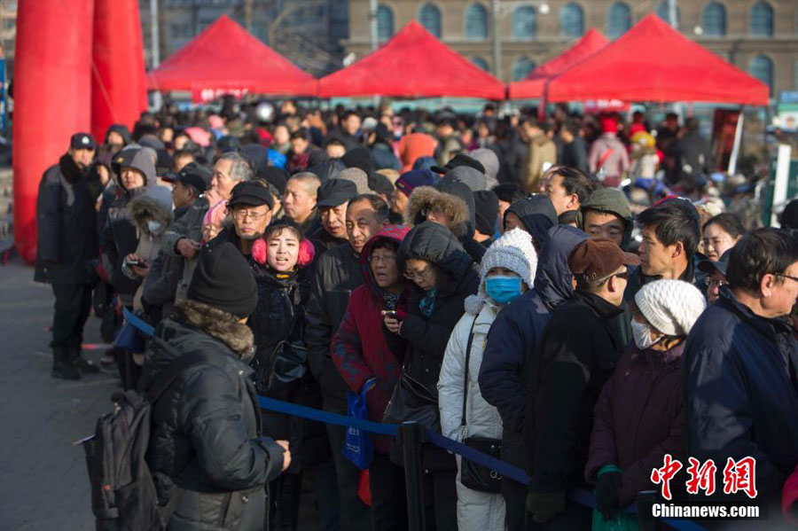 1月5日,北京市民在邮局外排长队抢购猴票。当日,中国第四轮猴年生肖邮票《丙申年》正式发售。该邮票1套2枚,面值为2.40元人民币。图案内容分别为:灵猴献瑞、福寿双至。 中新社记者 李慧思 摄