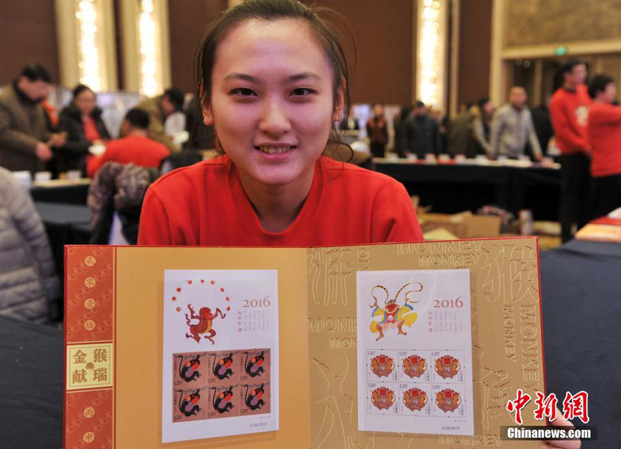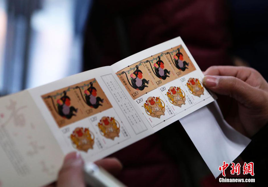 1月5日上午,中国第四轮猴年生肖邮票《丙申年》正式发售。该邮票1套2枚,面值为2.40元人民币。图案内容分别为:灵猴献瑞、福寿双至。图为中国邮政石家庄分公司工作人员展示邮票。 中新社记者 翟羽佳 摄