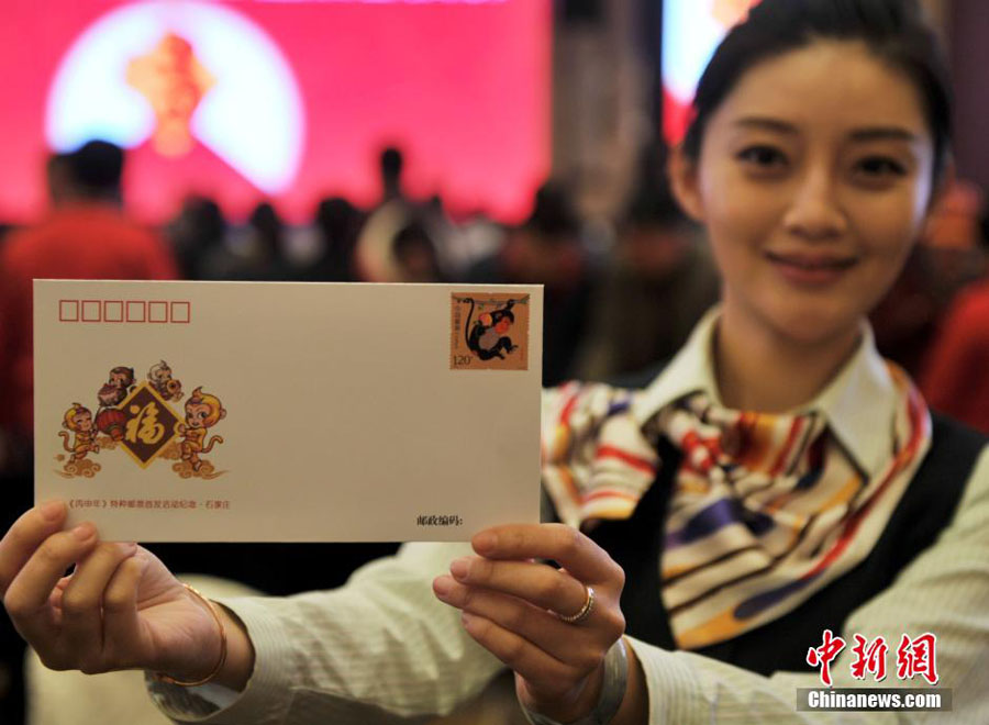 1月5日上午,中国第四轮猴年生肖邮票《丙申年》正式发售。该邮票1套2枚,面值为2.40元人民币。图案内容分别为:灵猴献瑞、福寿双至。图为中国邮政石家庄分公司工作人员展示邮票首发活动纪念封。 中新社记者 翟羽佳 摄