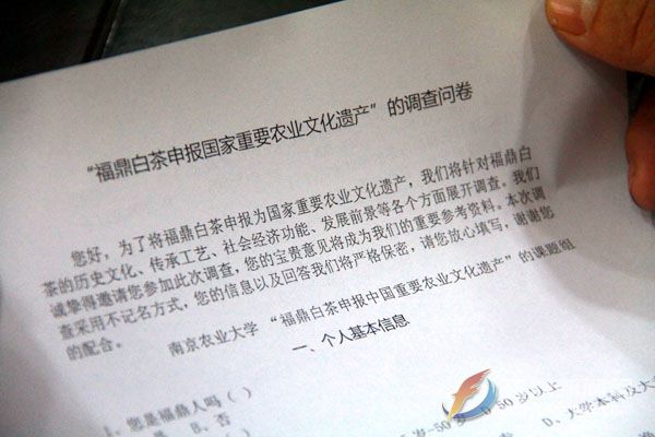 为了将福鼎白茶申报为国家重要农业文化遗产,近日,南京农业大学人文与社会科学学院党委书记朱世桂教授率“福鼎白茶申报中国家重要农业文化遗产”课题组一行深入福鼎市对福鼎白茶的历史文化、传承工艺、社会经济功能、发展前景等各个方面展开实地考察与调查。