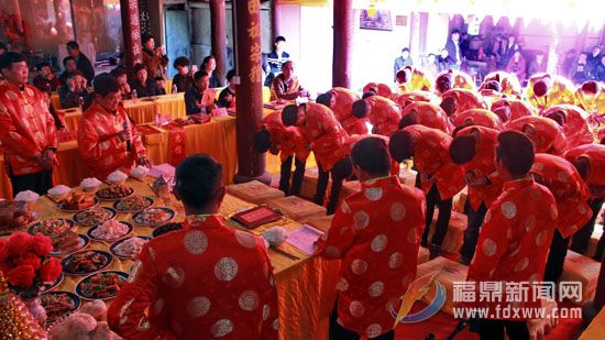 上午十时许,祭祖仪式在庄严肃穆的乐曲声中拉开帷幕,24名身穿盛装的陪祭人员陆续走进祭台,向列祖列宗上香鞠躬并行三拜就叩大礼和依次敬献香茗、佳酿、果品、糕点、山珍、海鲜等贡品之后长跪伏首,接下来是主祭人员恭读祭文和祝颂词,最后所有参加祭祖人员和到场宗亲起立向祖宗行三鞠躬后礼毕,整个仪式持续半个小时左右。