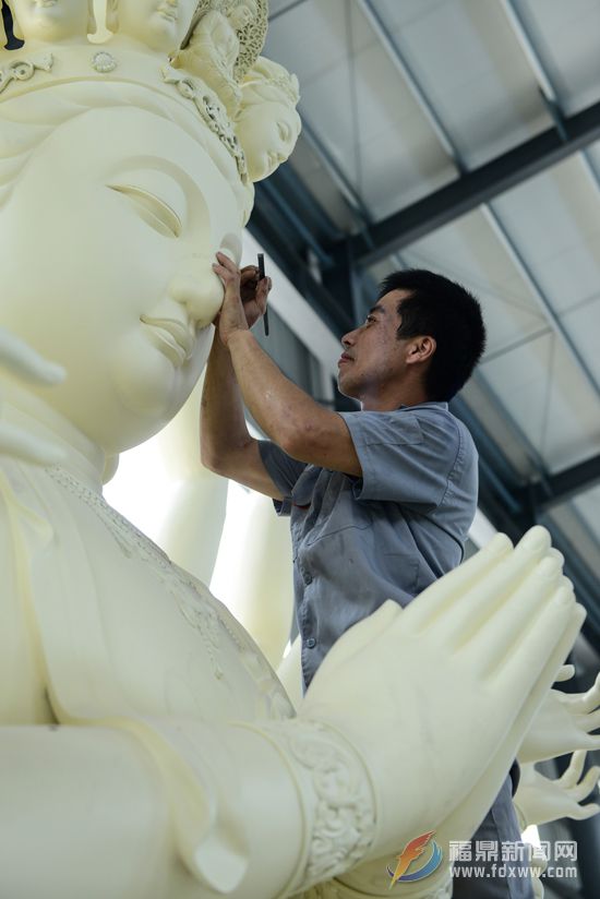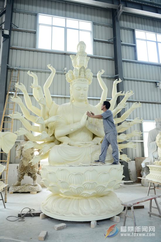 记者随后来到文巧塑铸工艺有限公司,走进周文巧的制作厂房,如来的庄严,观音的慈悲,五方佛的祥蔼……琳琅满目的雕塑工艺品映入眼帘,令人目不暇接,陶醉其中。
