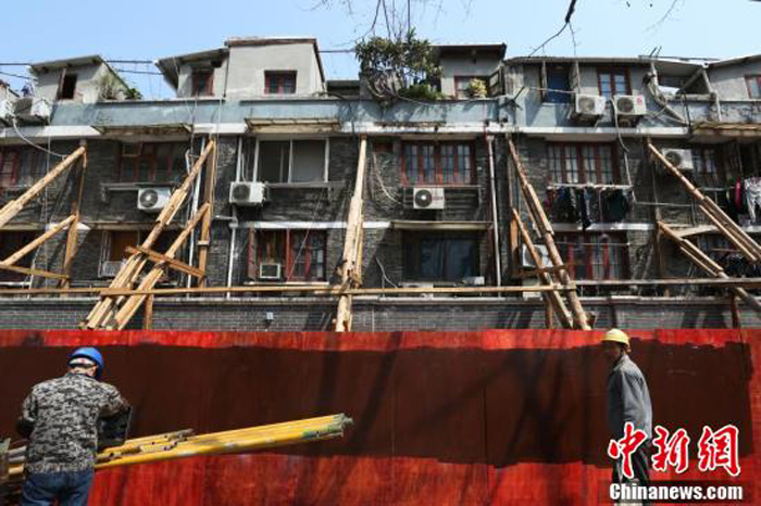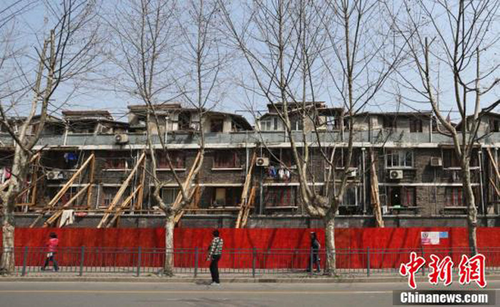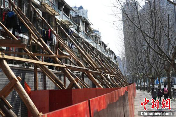 3月16日,一栋位于上海市中心的居民楼墙体倾斜,仅靠外墙数十根木桩进行加固支撑,几十户住户受到影响。据了解,此处房屋开裂倾斜是由于相隔一街的两个建筑工地施工造成的。 中新社记者 张亨伟 摄[!--empirenews.page--]