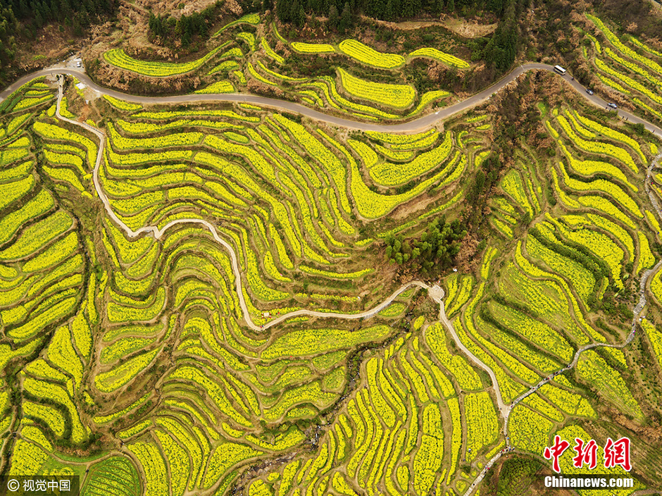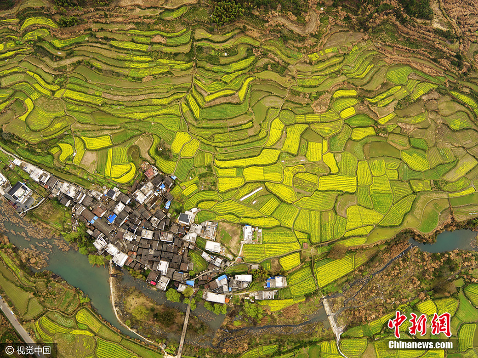 2016年3月17日,航拍江西婺源进入盛花期的梯田油菜花海。早春三月,“中国最美乡村”江西省婺源县十万亩油菜花陆续开放,金灿灿的油菜花海与白墙黛瓦的徽式民居相映,花海片片,风景独好,构成一幅优美的田园风光画卷。 图片来源:视觉中国[!--empirenews.page--]