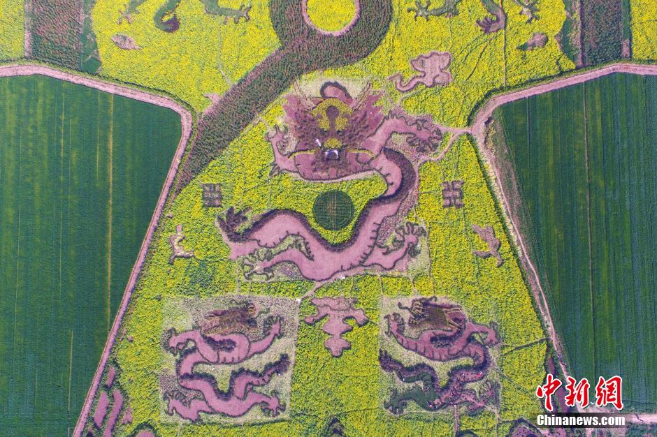 3月21日,农民在田野内“编织”“龙袍”。南京六合油菜花盛开,当地农民加紧制作巨型“龙袍”和“双龙戏珠”迷宫,从空中俯瞰,颇为震撼。中新社记者 泱波 摄