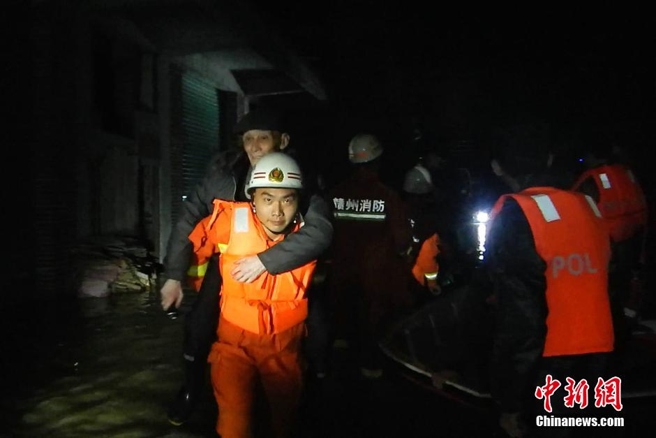 在赣州市区,上涨的洪水引发了城市局部内涝,积水深至行人膝盖。连日来,在灾情较为严重的赣州市赣县,消防官兵持续作战,涉险深水区,往返在险象重生的水流中,将被困群众救出送至临时安置点安置。陈沛志 摄[!--empirenews.page--]