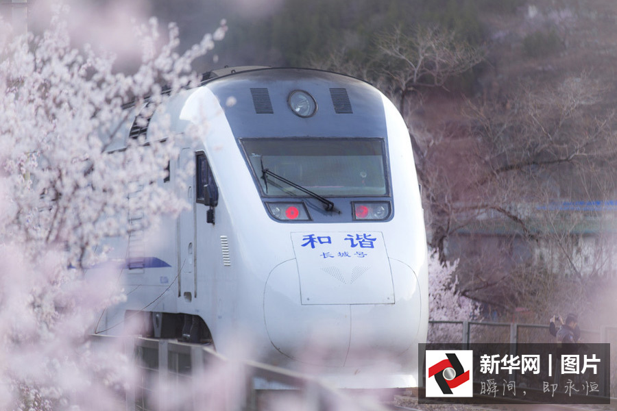 2016年3月23日,中国北京,又到一年花开时,数京城最美的铁路景色还看京张铁路居庸关。漫山遍野的桃花盛开,S2雪白的列车穿行其中,美不胜收。图片来源:东方IC
