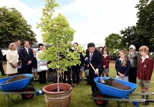 习近平同塔斯马尼亚州代州督布洛一道种下一棵玉兰树苗,孩子们为树苗浇水。习近平对孩子们说,我们要播撒中澳友谊的种子,让它们生根发芽、枝繁叶茂。两国少年就是友谊的种子。我希望你们今后到中国学习、旅游。你们可以继续给我写信,我愿意分享你们的好消息。