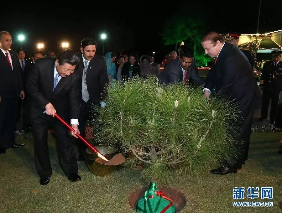 2015年4月20日,国家主席习近平同巴基斯坦总理谢里夫一道,在伊斯兰堡的巴基斯坦总理府种植友谊树。