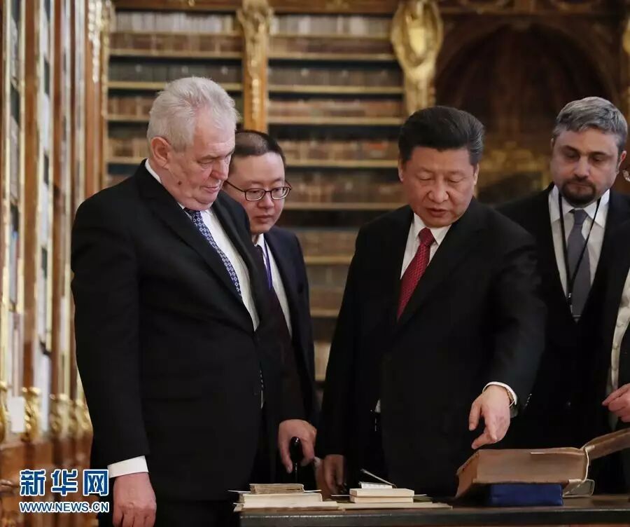 习近平抵达图书馆时,泽曼在藏书阁大门迎接并陪同参观。图书馆馆长向习近平介绍馆藏中捷交往书籍。随后,两国元首前往室外露台,俯瞰布拉格景观。