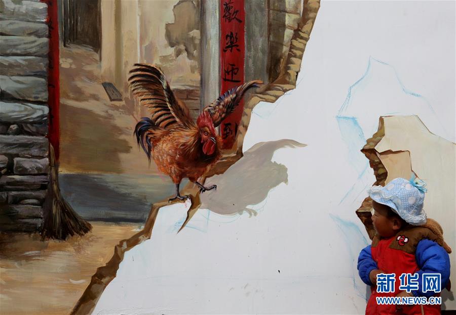 新华社照片,临沂(山东),2016年3月30日 山东郯城:3D立体画扮靓新农村 3月30日,在山东省郯城县在建的红石村文化广场,一名儿童在观看墙上的3D立体画。近日,山东省郯城县郯城街道农村文化广场墙体上,新绘制了一幅幅反映农村生活和面貌的油画和3D立体画,为农村增添了新的景象,吸引不少村民驻足欣赏。新华社发(张春雷 摄)