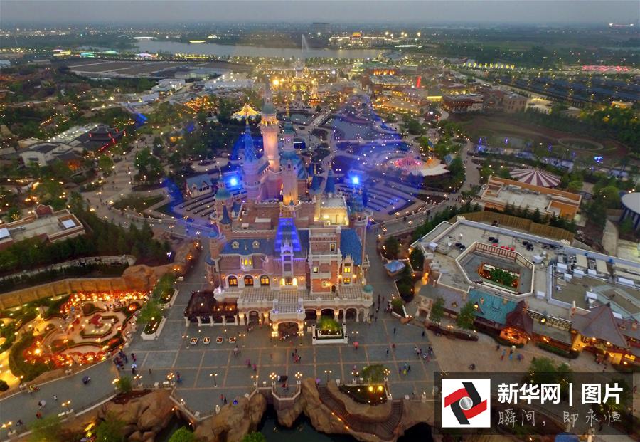 2016年5月8日,航拍首度亮灯的上海迪士尼乐园美景。