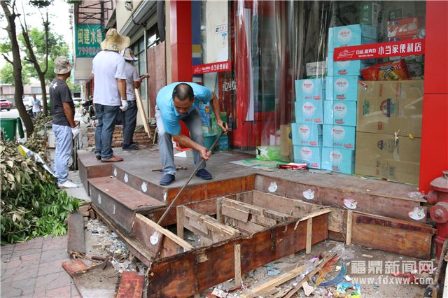 执法人员指挥工作人员拆除超市私自安设的木踏板。