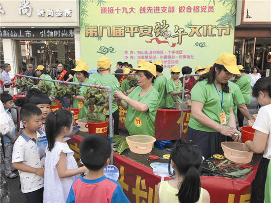 本报讯(陈是)5月26日,市人民剧场前的广场上好生欢快,包粽子、义诊、免费体检、发放宣传单……原来,这是桐山街道十字社区党支部联合市委组织部、编办、供销社、卫计局等单位在职党员志愿者和辖区计生协会、“杨记头年粽”志愿者们,一起携手开展十字社区第八届“平安端午”文化节活动。