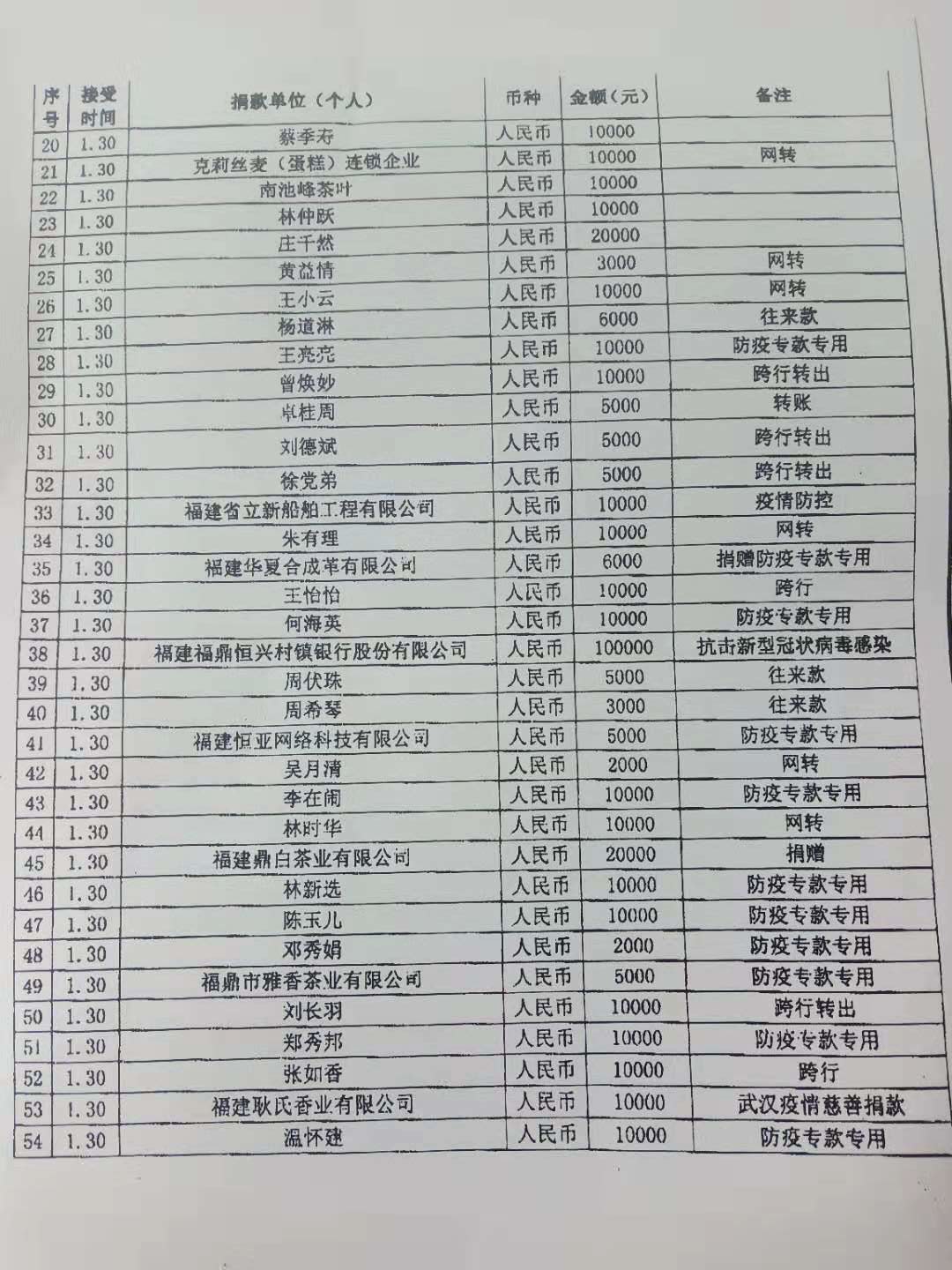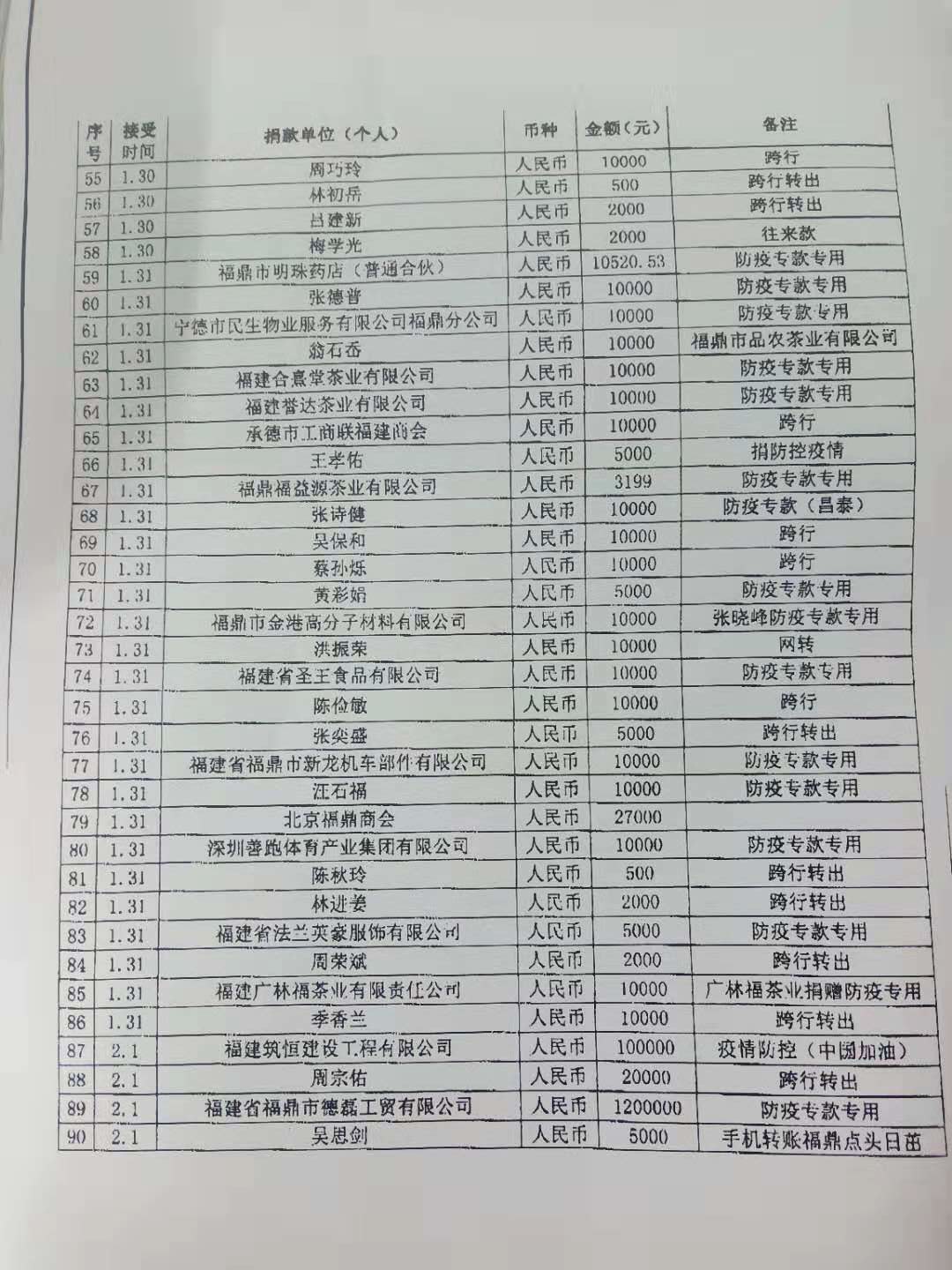 福鼎市红十字会应对新型冠状病毒感染肺炎疫情接收社会捐赠情况公布(1)