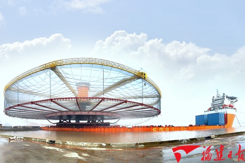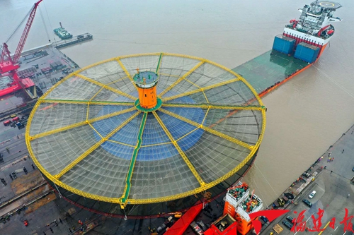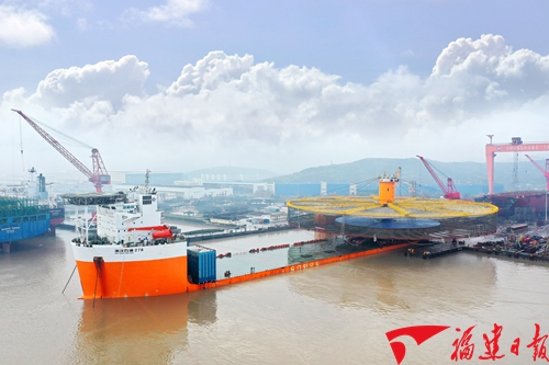 22日,福鼎单柱半潜式深海渔场主体工程顺利完工,由半潜船运送至福鼎台山列岛附近海域进行安装调试,计划下月初投入使用。 (福建日报记者 林辉 通讯员 蔡雪玲 蔡子厚 摄影报道)